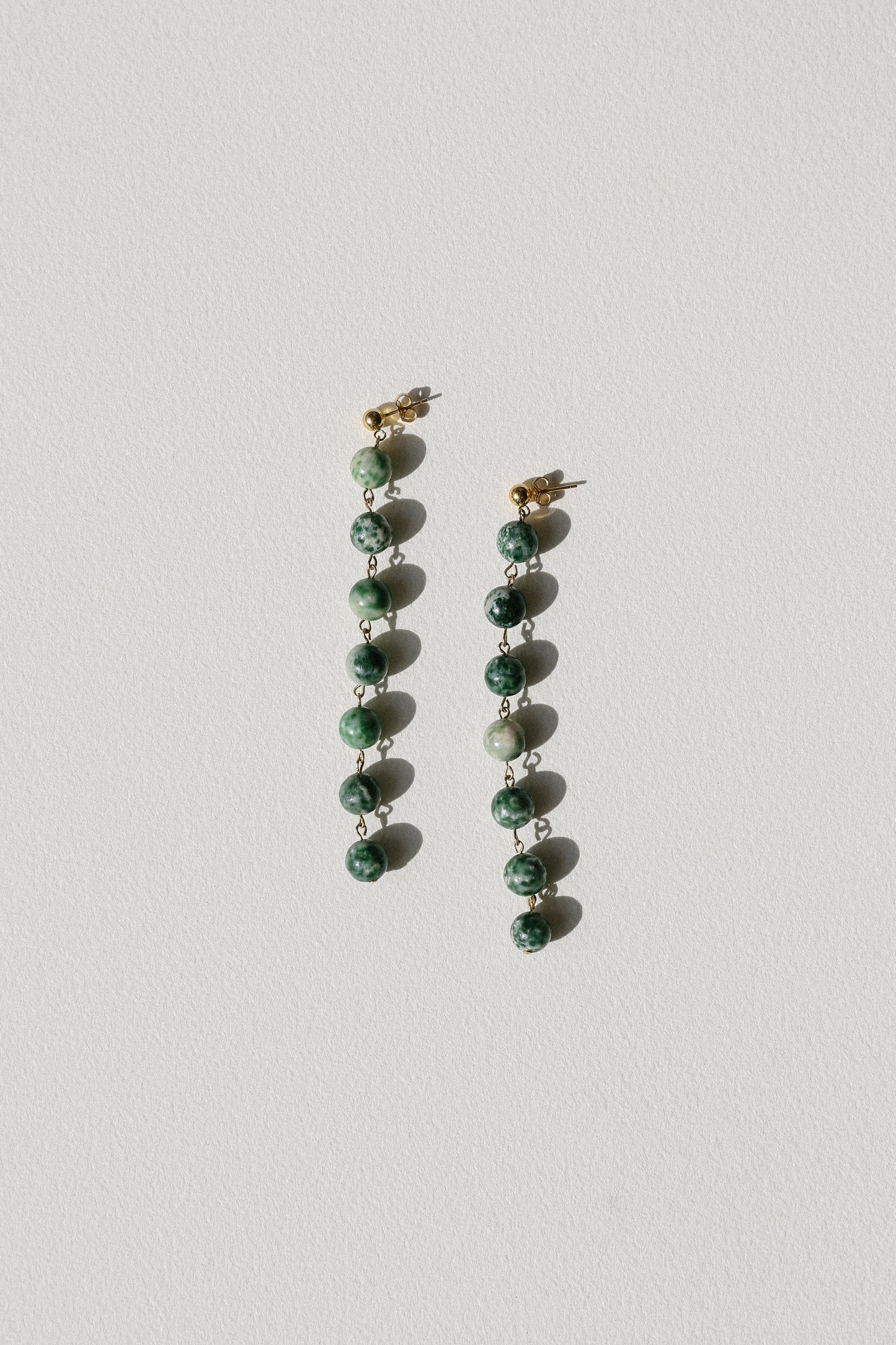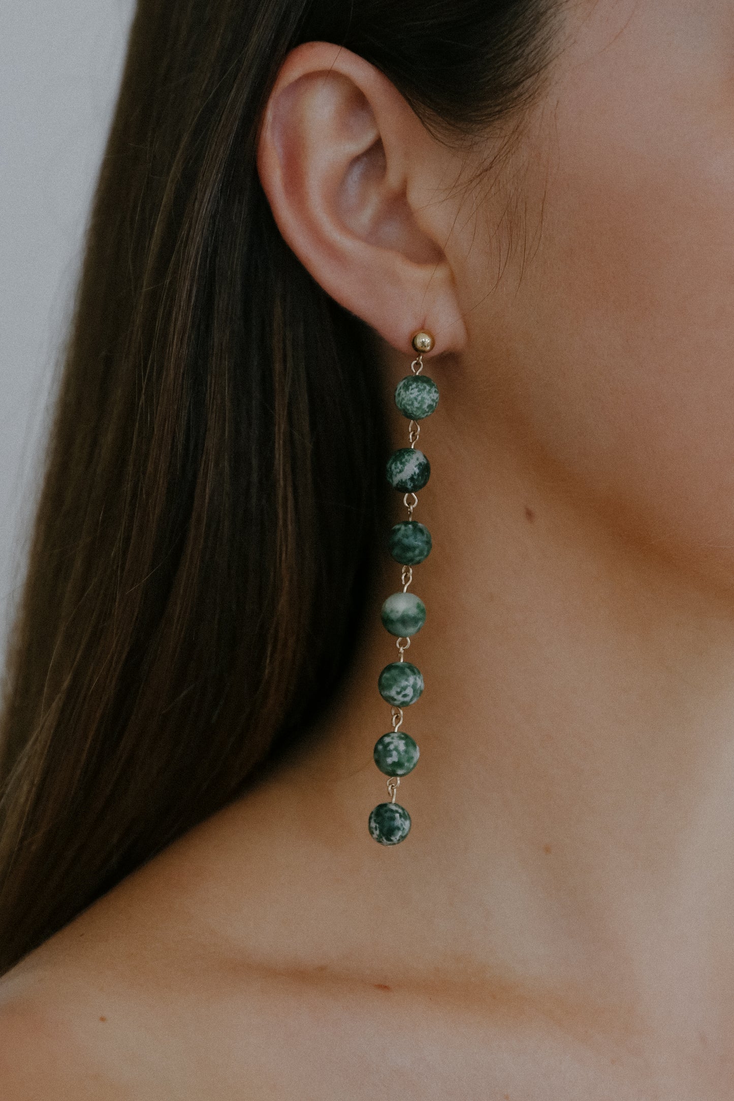 The Juniper Drop Earrings feature a long line of spotted jasper gemstones, secured with a post and butterfly back. Finished with the option of 14k gold filled or sterling silver findings. Handmade to order in Australia.