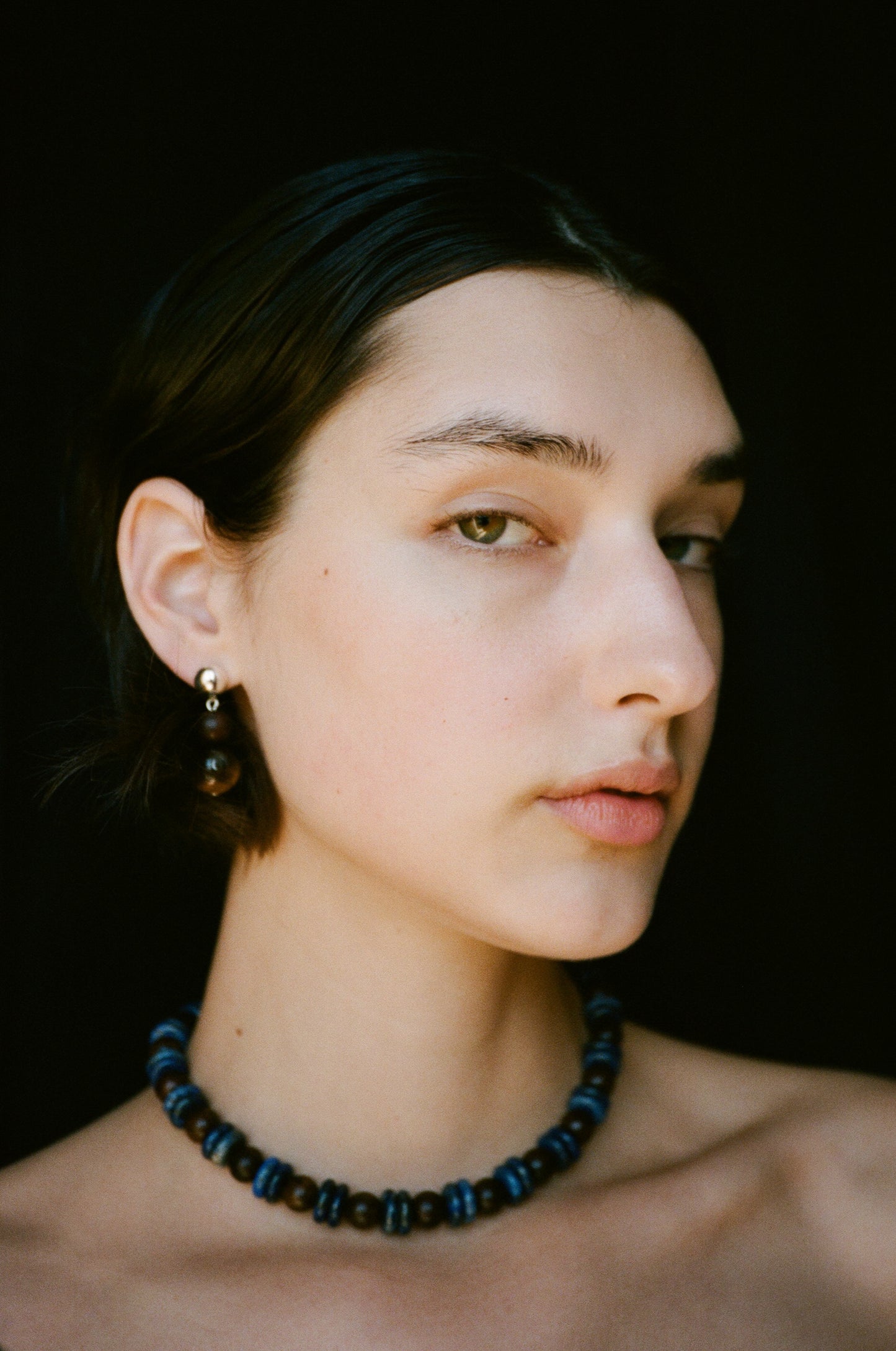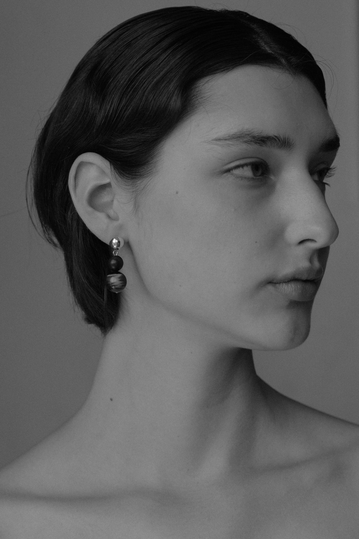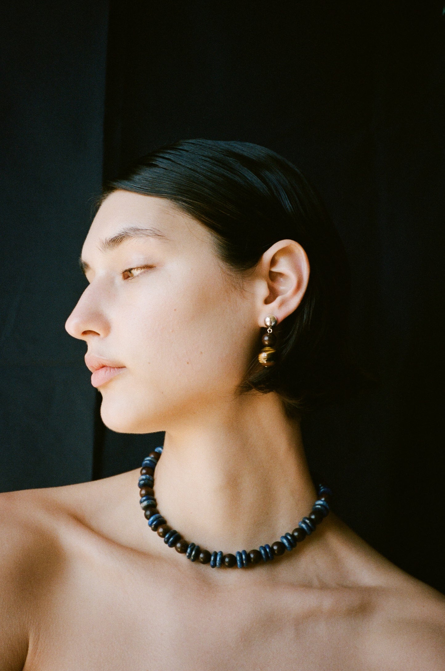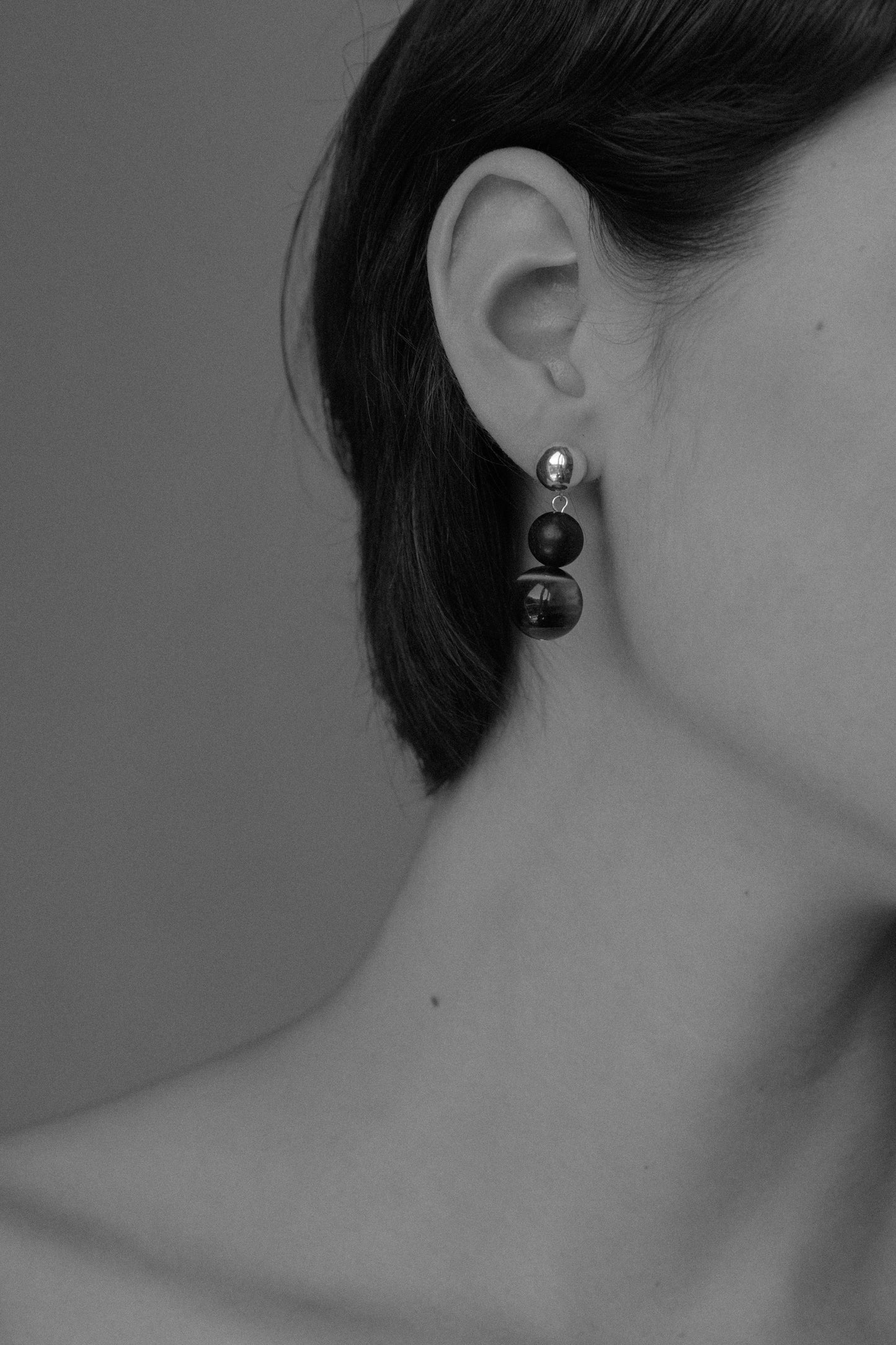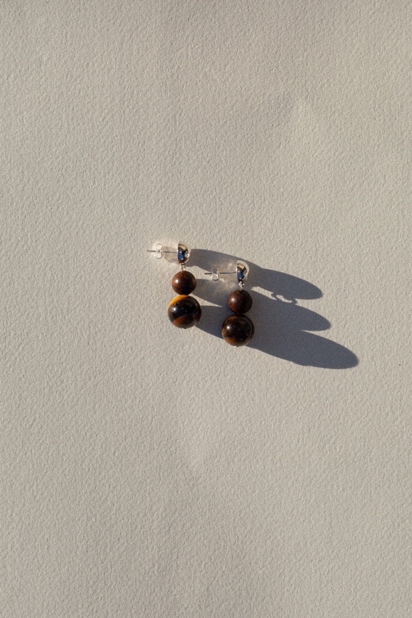 The Adrien Earrings feature a custom-cast sterling silver ball and post, made in-house exclusively for Vermeer Studio. Followed by a stacked tiger eye gemstone and ebony timber bead. Handmade to order in Australia.