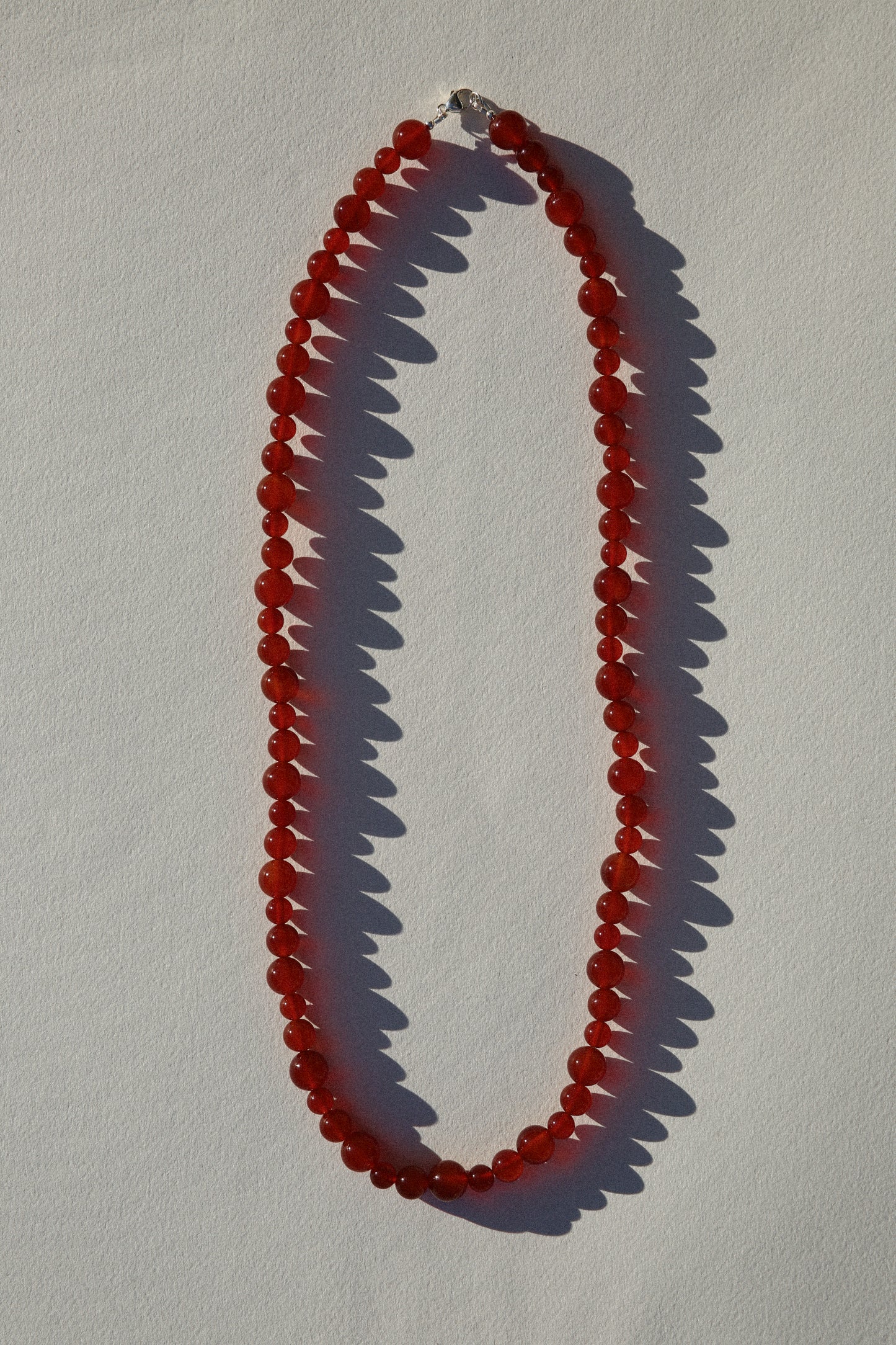 The Javier Necklace features carnelian beads in varied sizes strung along a 75cm length, finished with the option of 14k gold filled or sterling silver clasp. Handmade to order in Australia.