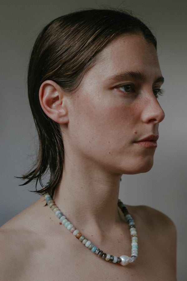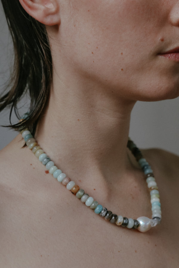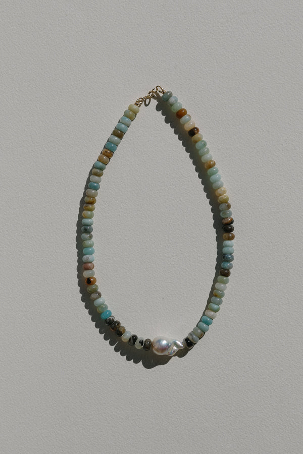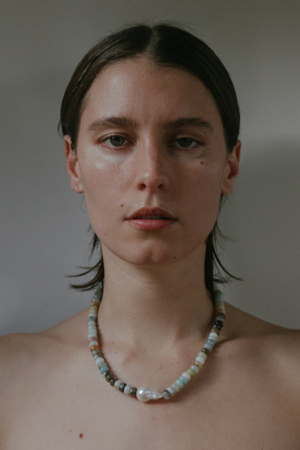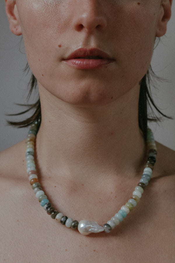 The Loretta Necklace from the Camille Collection: featuring amazonite gemstones and a large feature freshwater pearl. Handmade in Australia and secured with a clasp.