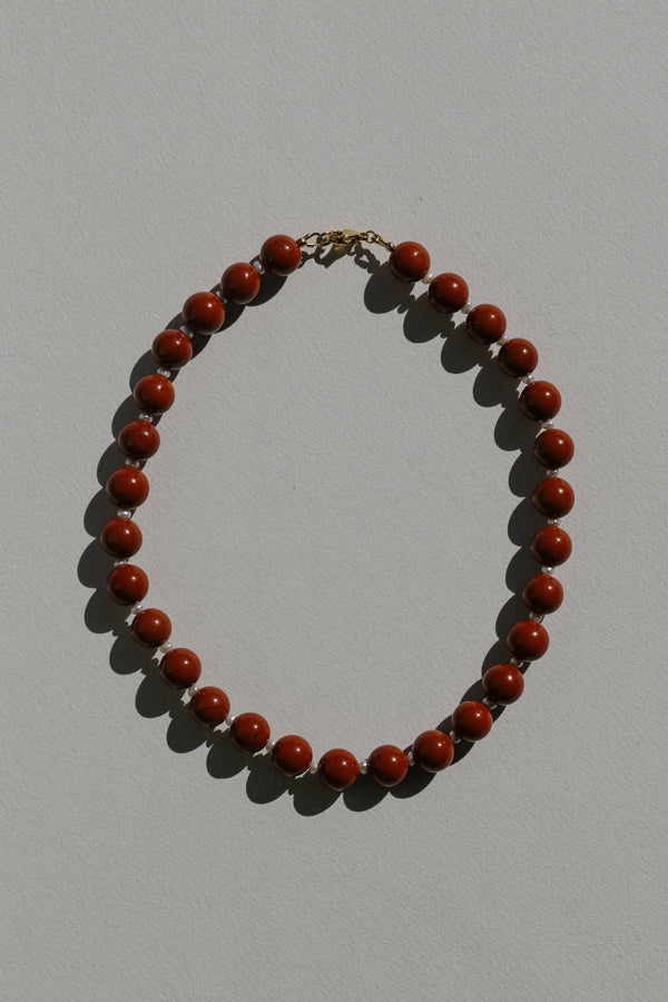 The Athena Necklace from the Camille Collection features a considered pairing of red jasper and freshwater pearls. Finished with the option of 14k gold filled hardware or sterling silver and secured with a clasp. Handmade to order in Australia.
