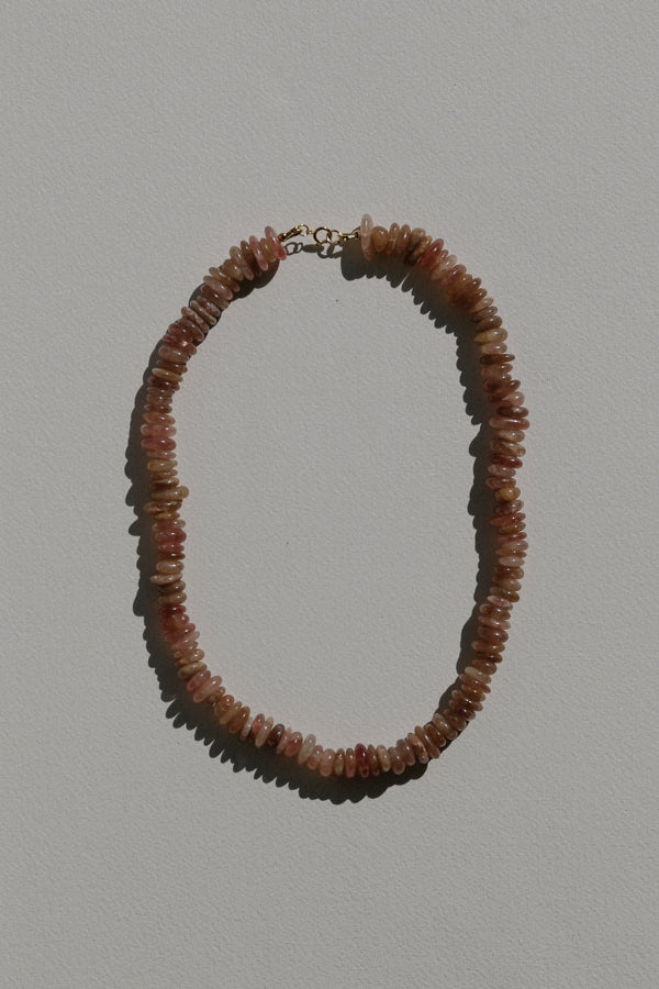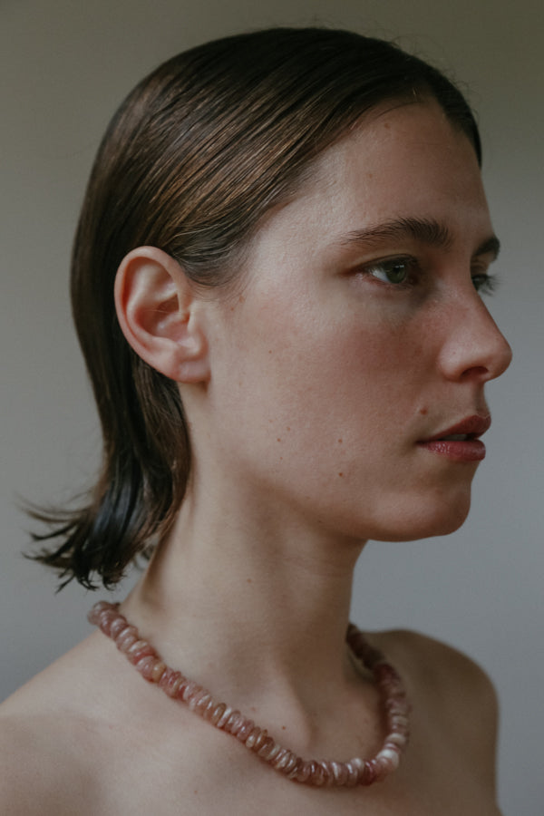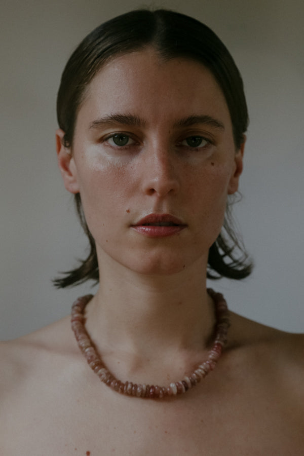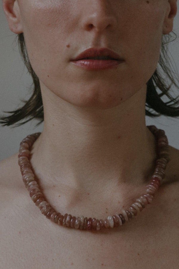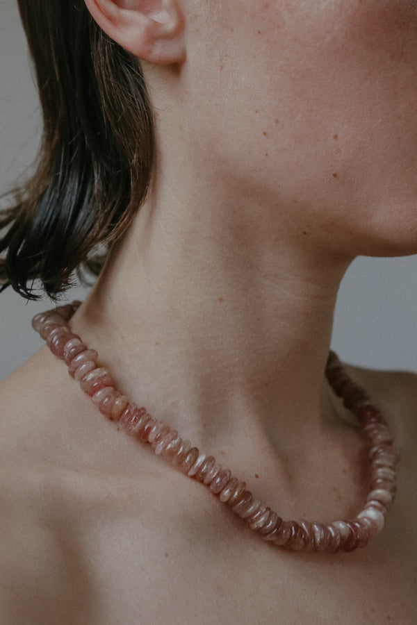 The Delphine Necklace from the Camille Collection: featuring strawberry cherry quartz gemstones. Handmade in Australia and secured with a clasp.