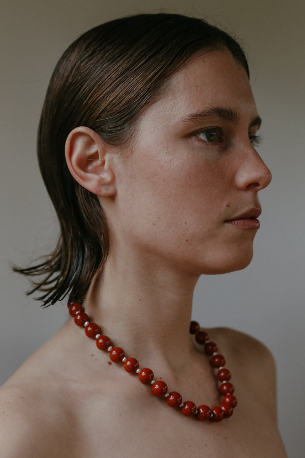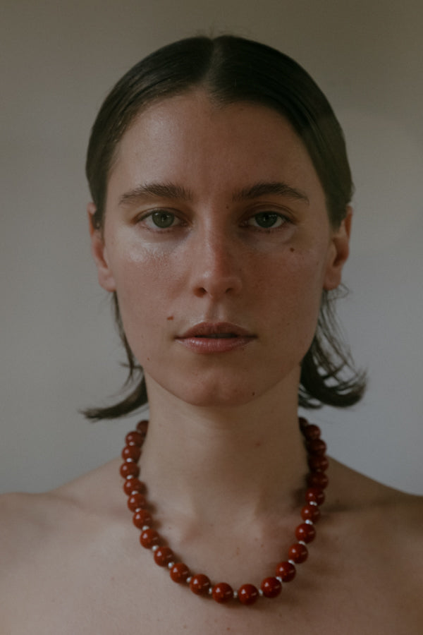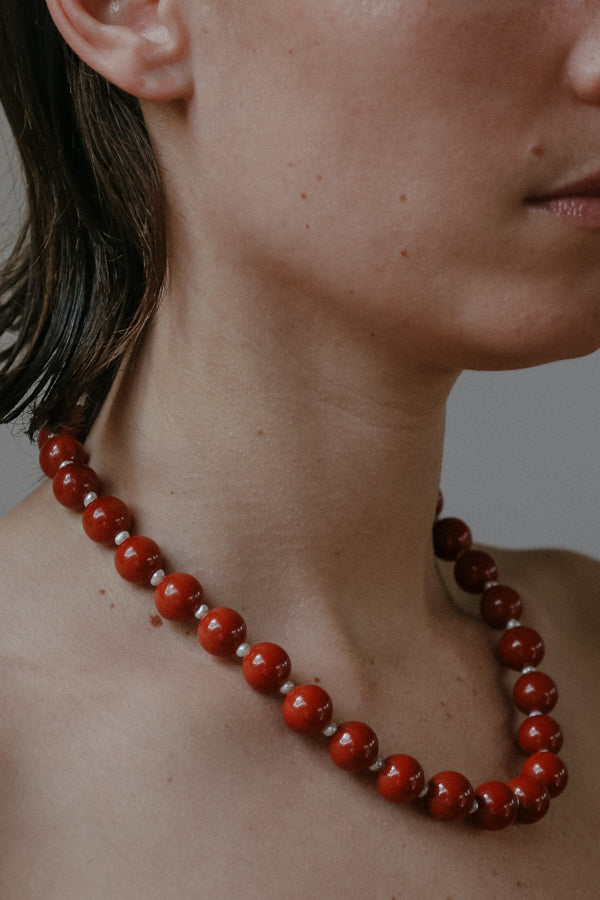 The Athena Necklace from the Camille Collection features a considered pairing of red jasper and freshwater pearls. Finished with the option of 14k gold filled hardware or sterling silver and secured with a clasp. Handmade to order in Australia.