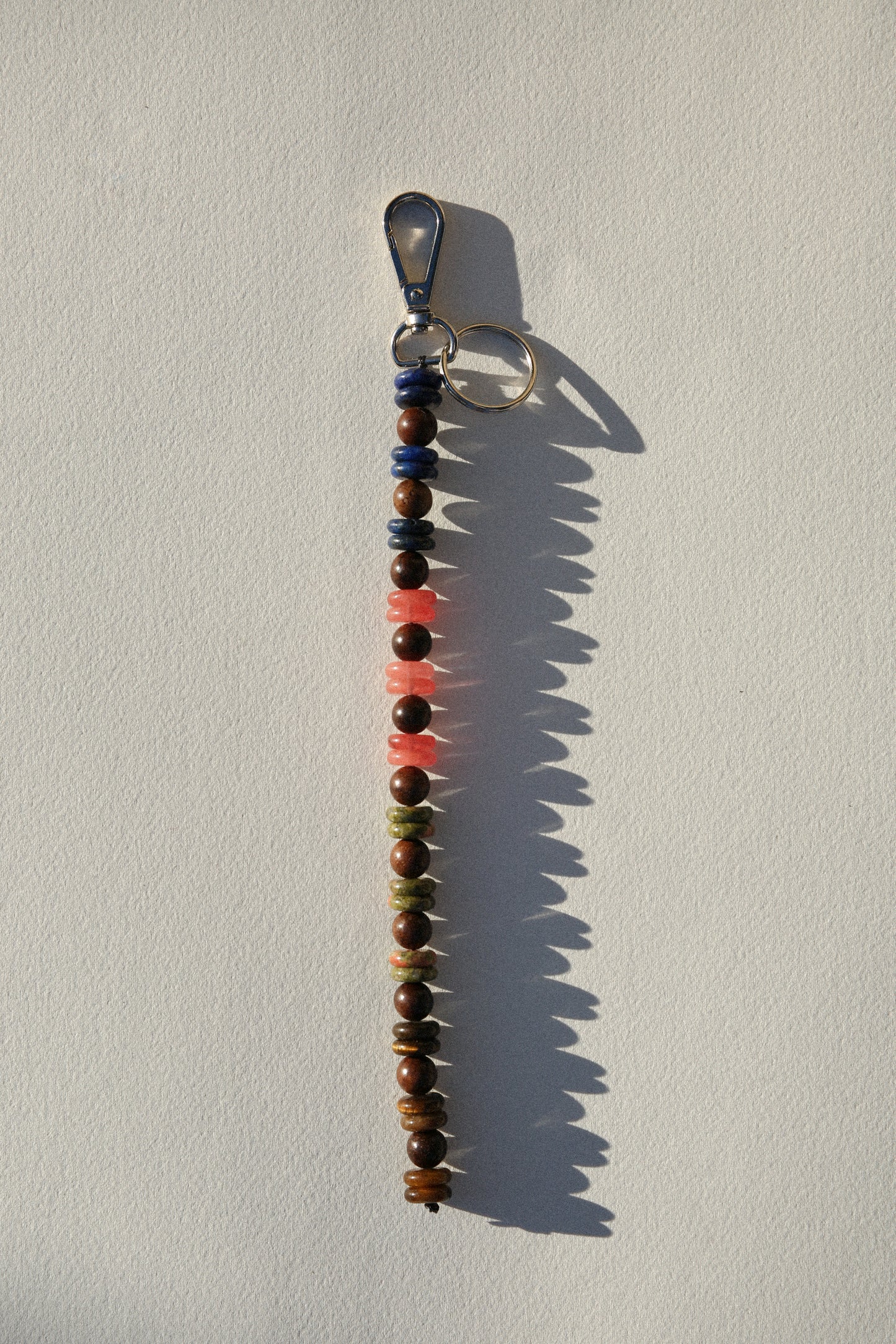 The Hans Keychain features a single strand of timber beads combined with rondelle disc beads in various colours. Finished with sterling silver keychain hardware. Handmade to order in Australia.