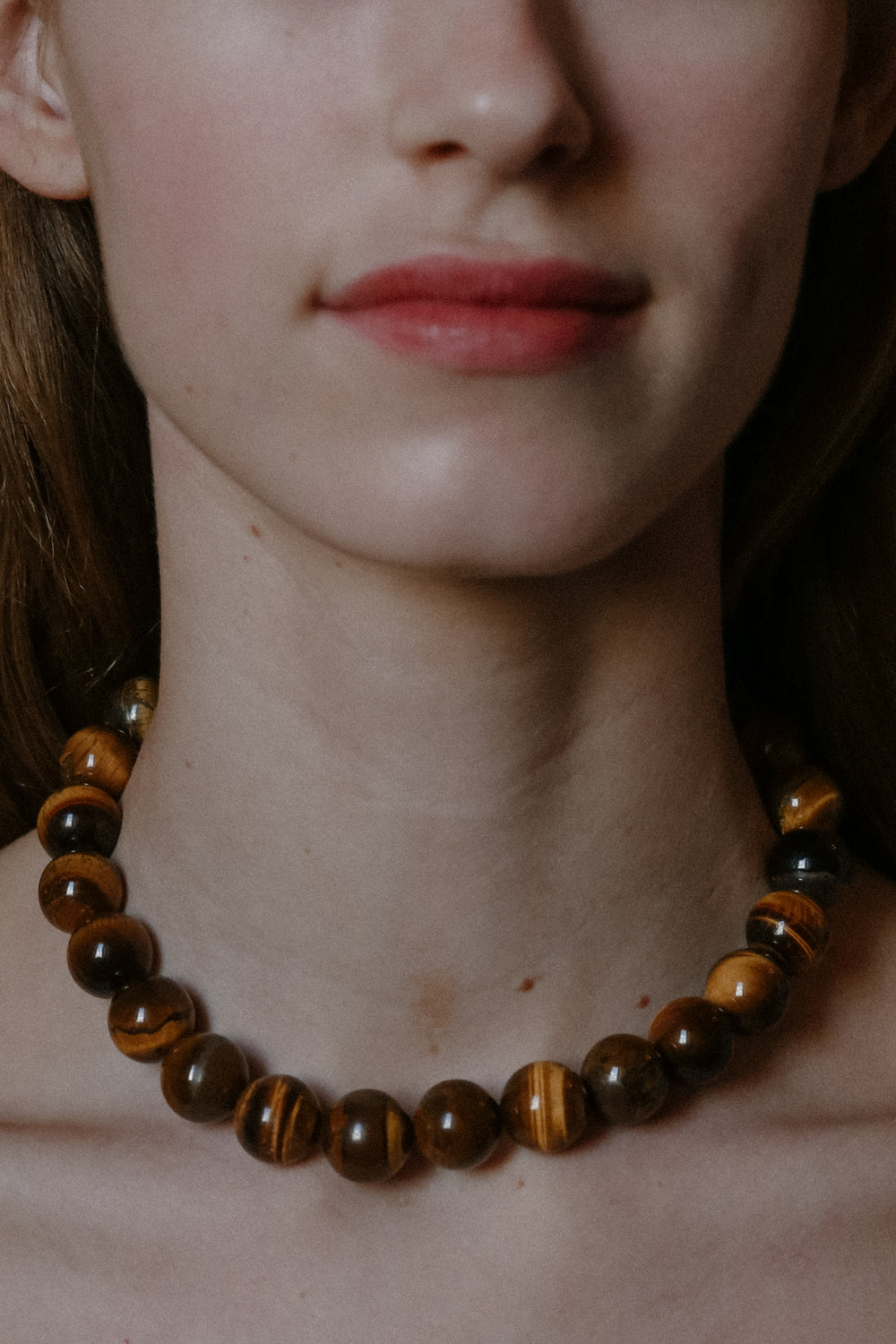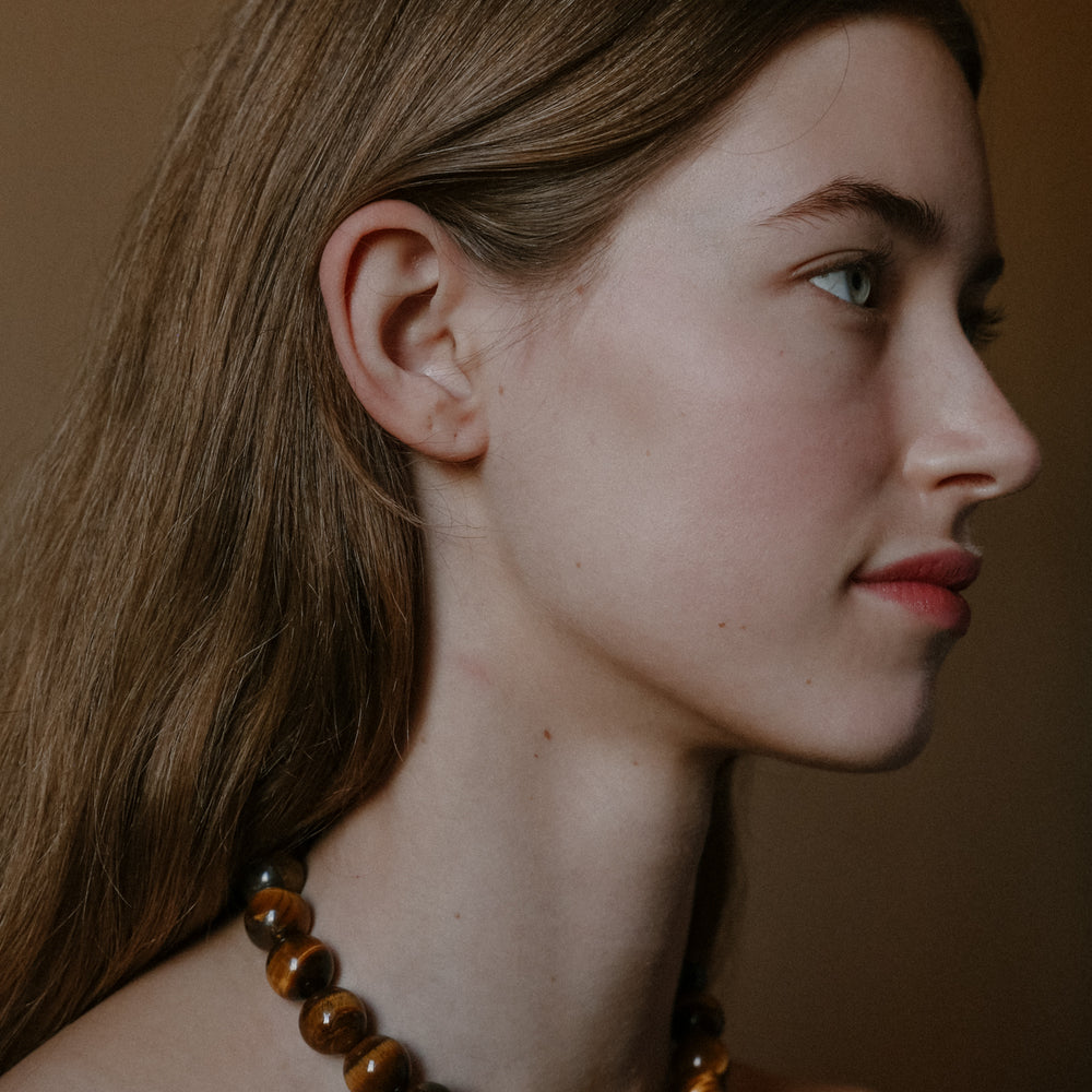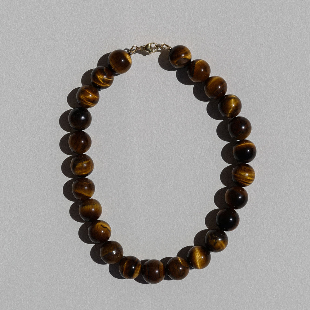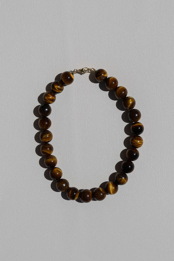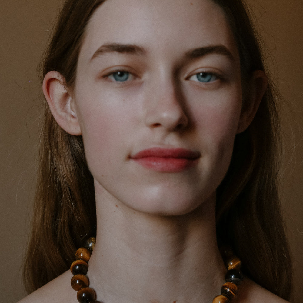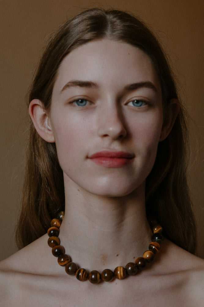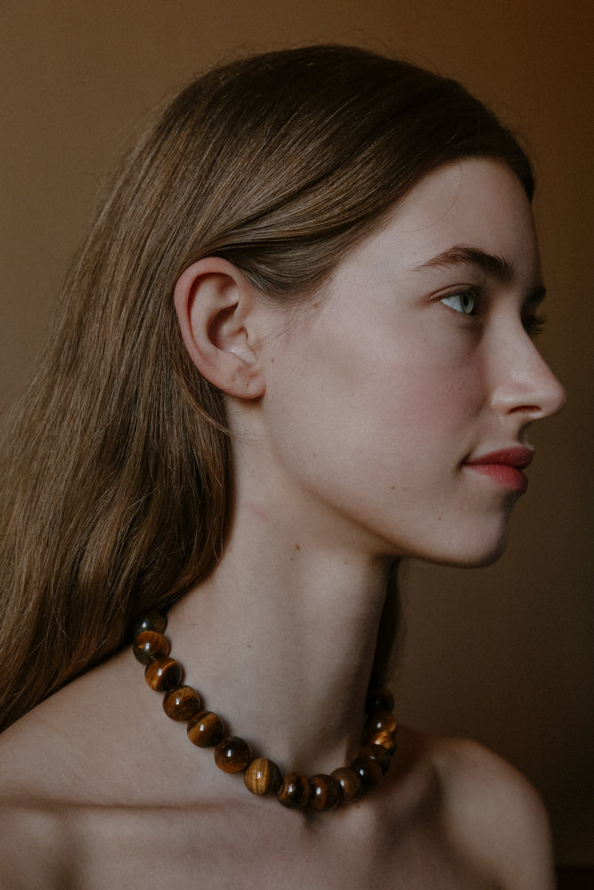 The Mirandah Necklace from the Louelle Collection, featuring tiger eye gemstones. Handmade in Australia and secured with a clasp.