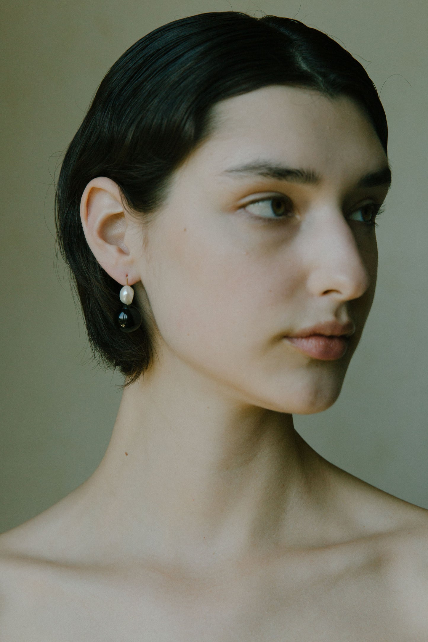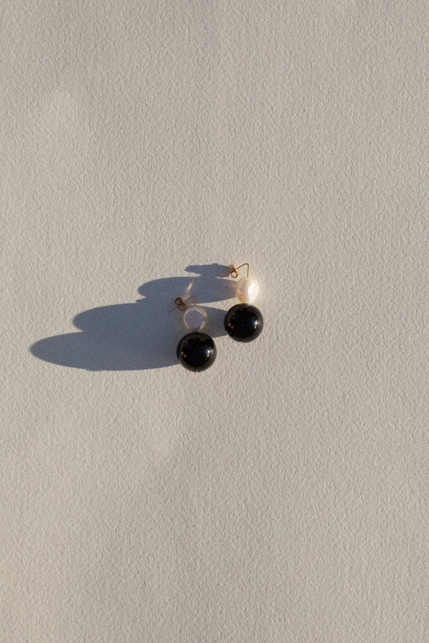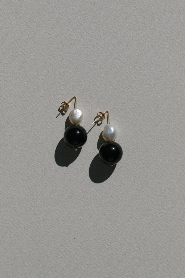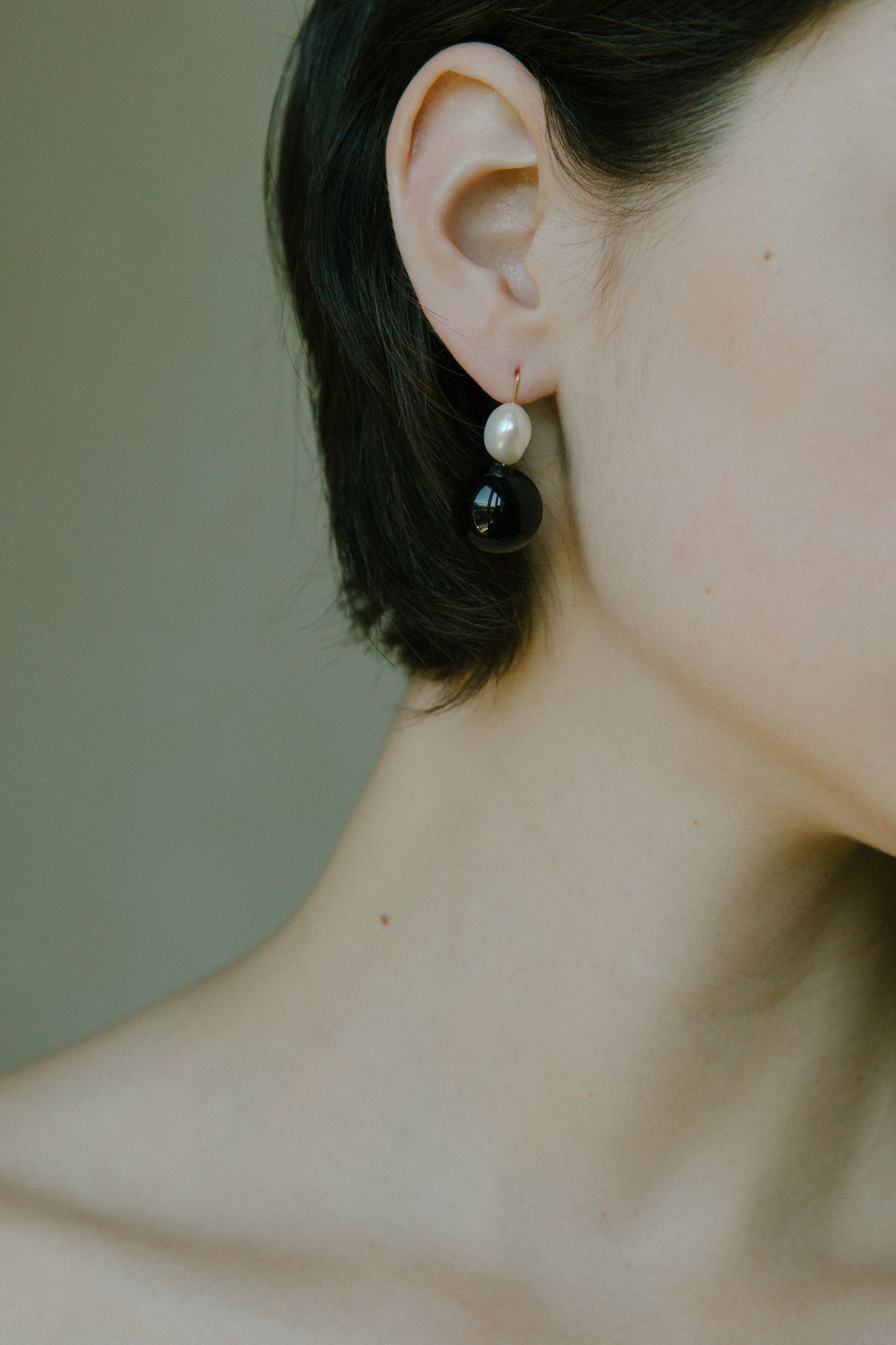 The Ophelia Earrings feature two stacked beads — a freshwater pearl and an onyx gemstone — secured with a post and butterfly back. Finished with the option of 14k gold filled or sterling silver hardware. Handmade to order in Australia.